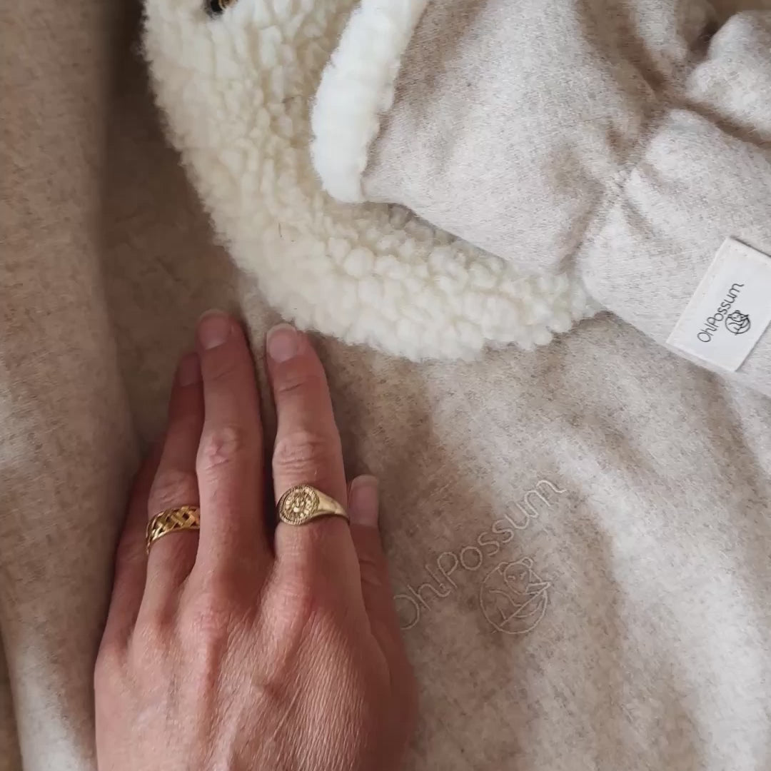 Dos piezas favoritas cuidadosamente seleccionadas: la manta de canguro para acurrucarse y los botines para bebé hechos de 100 % lana merino libre de mulesing acompañan a tu hijo desde el primer día, durante todo el año.